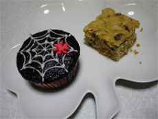 嫁はハロウィンなので張り切ってアイルランドでハロウィンに食べられるTea Blackというフルーツケーキ(松井ゆみ子さんの「アイルランドのおいしい毎日」よりマスターにBarm Blackって説明しちゃいましたが、Barm~は同じくハロウィンに食べられるイーストを使ったレーズンパンのことでした)と、 イカスミ ブラックココアパウダーという黒いココアを使ったマフィンにアイシングで蜘蛛の巣を書いて持参したんですが、マフィンの方が気温差なのかラッピングのせいなのかみんなに渡す頃には蜘蛛の巣が袋にくっついて溶けちゃって何が何だかわからない有様…(T_T)また修行しておきます(そっちの修行じゃなくて練習しろー 笑)因みにBarm’sさんの場所で昼間営業している「369ごはん」には竹炭を使った真っ黒いマフィンがあるので、こちらも気になる方は是非チョコにお塩がちょっと入った塩スイーツな感じで美味しいですよん♪