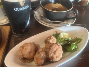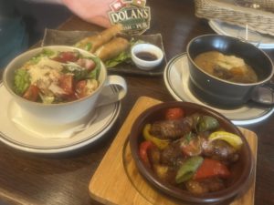 は①ピクルス(550円)、いぶりがっことベーコンのポテトサラダ(550円)②アイリッシュシチュー(825円)、豚バラのハニーバルサミコグリル(935円)、ジンジャーシーザーサラダ(ハーフ。660円)、アスパラフライ(825円)と旦那