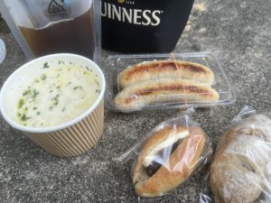 今年は天然酵母パンのおひさまのパンのくるみパンとあんバター(どっちも180円ぐらい)に花巻駅前のレガーメさんのいわい鶏のサルシッチャ(1本500円)とクラムチャウダー(600円)、「演奏者さんですか?」と声をかけてくださった、くまの森コーヒーさんのグァテマラ(450円)