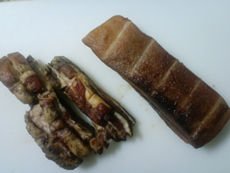 スモークって食材によってはピックル液に3日ぐらい漬け込んで、それを塩抜きしてから燻製するんですが、最近気に入ってるのは塩だけでシンプルに作るスモーク。右のベーコンは塩抜きが必要ないぐらいの塩(大体300gで片面小さじ1ずつぐらい)をふって4日ぐらい冷蔵庫で寝かせて2時間スモークしたんですが、中は生だけど表面はいい感じにスモーキーでおいしかった~ただ、長期保存には向かないので、切り分けてすぐ冷凍しましたけど(^-^;)