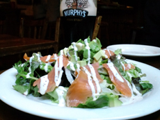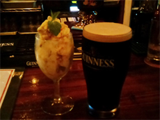 は①スモークサーモンとアボカドのサラダ(\800)②タンドリーチキンのタコス③ブラウンブレッド入りアイスクリームのベイリーズがけ(\500?)他にいつものコテージパイも頼みました(^-^)bもう1つ、「オイルサーディンとポテトの香草パン粉焼き(\800)」も頼んだんですが、ちょっと写真が暗すぎて載せられなかった!(>_<)こちらはおつまみにピッタリ◎な感じでした(^-^*)