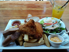 ランチメニューは①アイリッシュプレート(フィッシュ&チップス、ソーセージ、サラダ、バゲットの盛り合わせ。\1000)②ハンバーグランチ(\1000)③トマトチキンカレー(\950)④黒ダレ豚バラ焼肉丼(\950)の4種類。ウーロン茶、コーヒーなど数種類のフリードリンク付でした